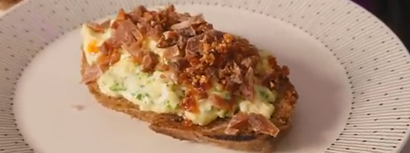 Paista leipäviipaleet voissa rapsakoiksi ja siirrä sivuun. Lisää pannulle kananmunat ja kypsennä koko ajan sekoittaen, kunnes muna menee kokkeliksi. Siirrä pannu liedeltä pois ja lisää tuorejuusto. Sekoita kunnolla sekaisin ja mausta suolalla ja pippurilla. Lisää kokkeli leipien päälle ja ripottele päälle lopuksi chiliöljyä, ruohosipulia ja hienonnettua Jerkyä!