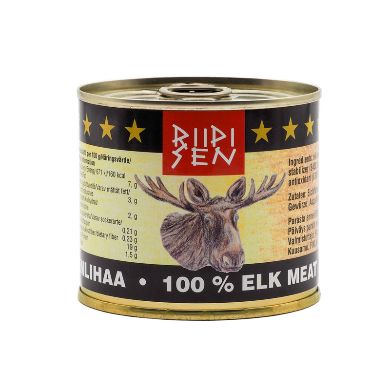 Ainesosat: Hirvenliha (86%), vesi, suola, perunatärkkelys, soijaproteiini, stabilointiaine (E450), dekstroosi, mausteet ja aromit (valkopippuri, maustepippuri, inkivääri, rosmariini, tim jami) hapettumisenestoaine (E316), säilöntäaine (E250).