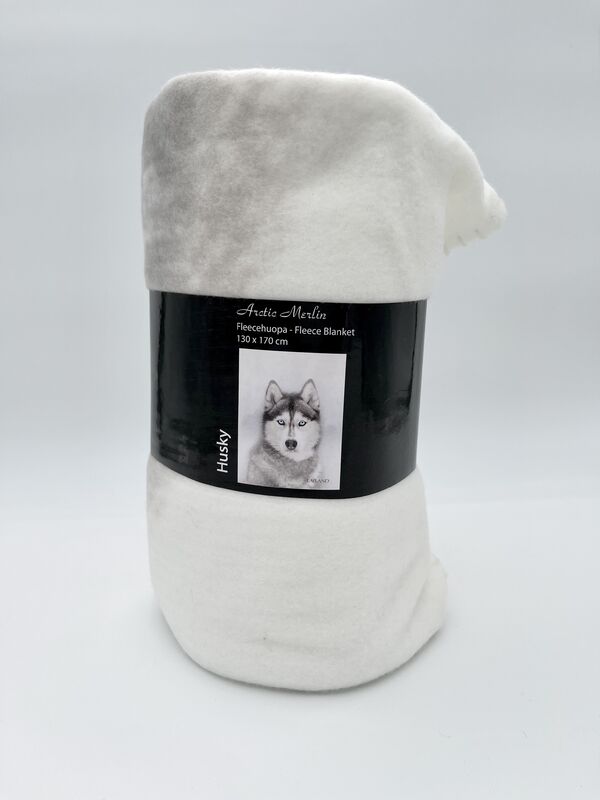 Lämmin ja pehmeä fleecehuopa, jossa huskyn kuva. Koko 130 cm x 170 cm.