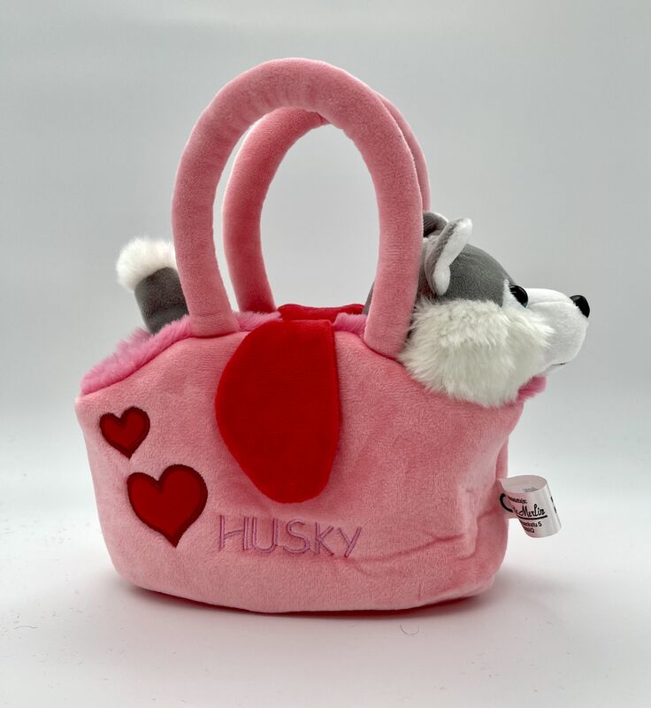 Husky ja pinkki laukku. Huskyn saa pois laukusta.