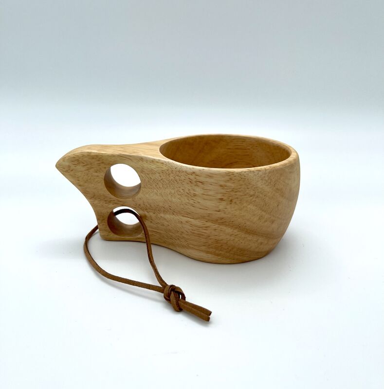 Tammikuksa nahkanauhalla. Tilavuus n. 2dl. Halkaisija n. 8cm ja korkeus n. 6cm.
