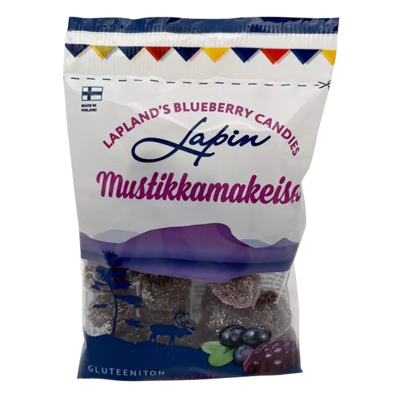 Lapin Mustikkamakeiset. Gluteeniton. Valmistettu Suomessa. Paino 85 g.