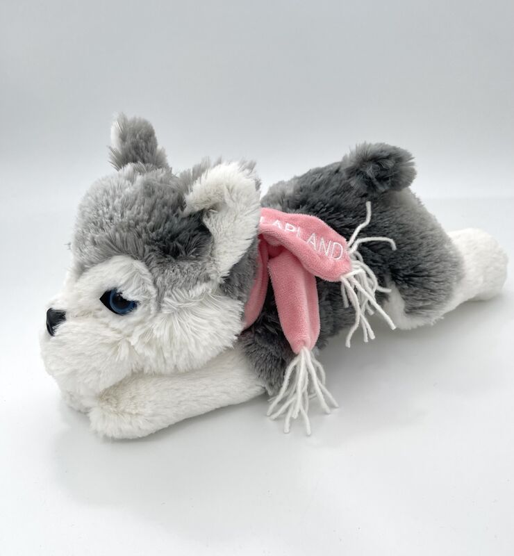 Makaava husky, jolla kaulassa kaulahuivi. Kaulahuivissa teksti Lapland. Pituus n. 30cm.