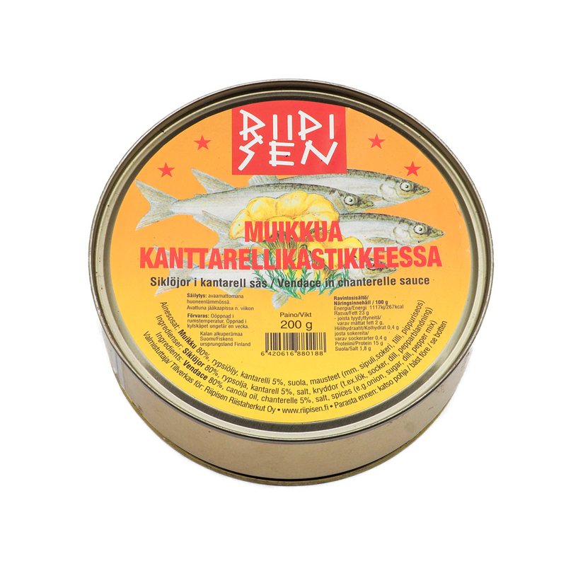 Ainesosat: Muikkua (75%), kanttarellia (5%), rypsiöljy, luonnonmausteet (sipuli, sitruunapippuri), suola (1,5%).