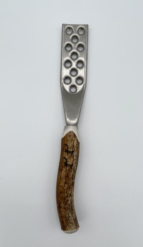 Poronluu suomustinrauta. Varressa kauniit lappiaiheiset polttokuviot. Valmistettu poronluusta ja ruostumattomasta teräksestä. Valmistettu Suomessa.