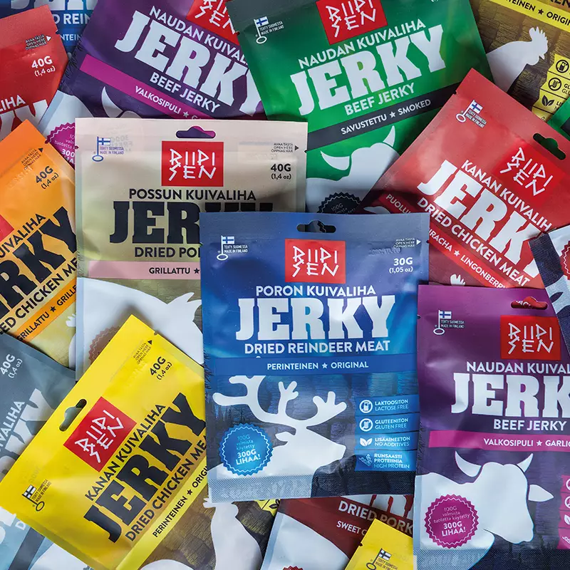 RIIPISEN kuivalihassa valmistukseen on käytetty lähes 35% enemmän lihaa kuin esimerkkitoimija J:n tuotteessa ja lähes 30% enemmän lihaa kuin esimerkkitoimijan K:n tuotteissa. (VERTAILU BEEF JERKY ORIGINAL)