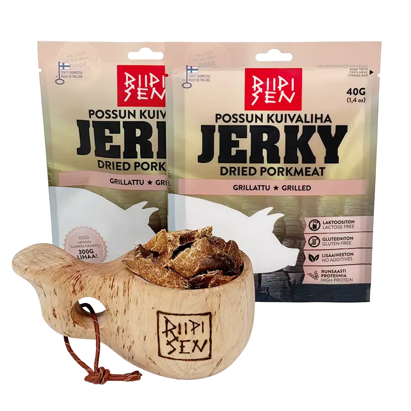 Koko perheen kuivaliha. Kotimaisesta lihasta, ilman lisäaineita ja jatkeita valmistettu, possun kuivaliha.
